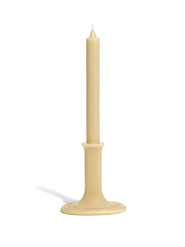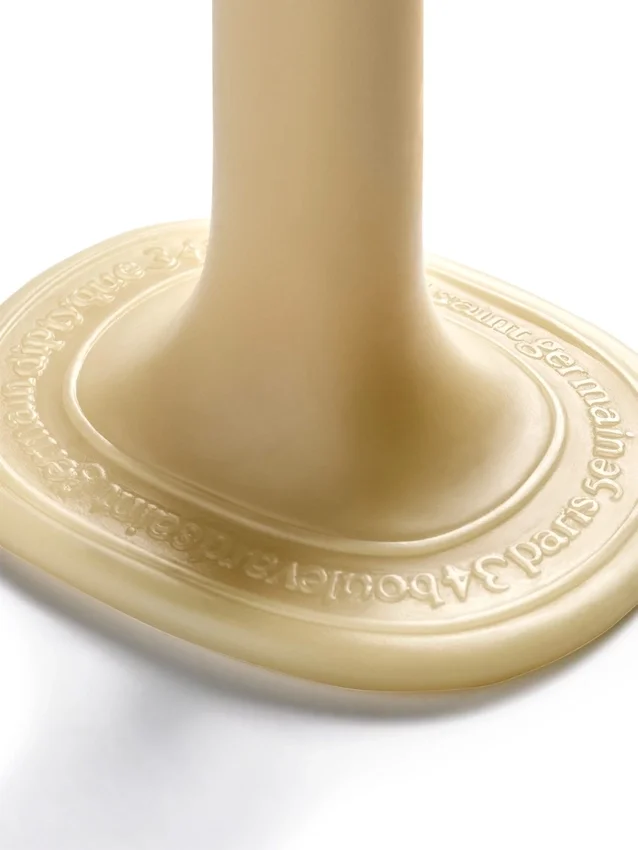 Une bougie de table colorée moulée dans de la cire parfumée. Elle parfume la pièce de notes d’arbres, d’épices et de bois, diffusant un parfum emblématique de la maison Diptyque : l’ambre.