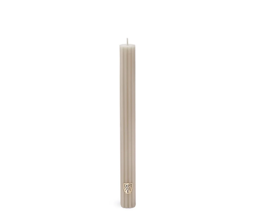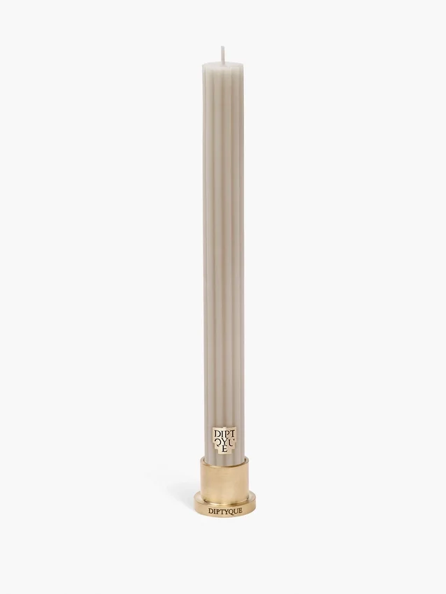 La bougie effilée « Feu de Bois », une variation Diptyque sur le thème de la cire moulée et parfumée, apporte une touche festive à la table.