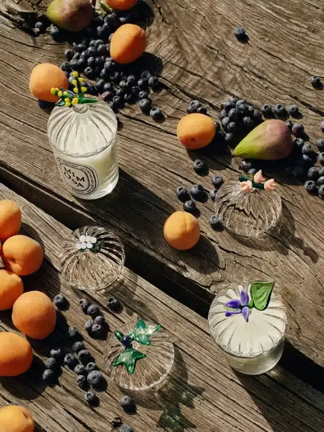 Diptyque a confié à l’artisan et maître verrier italien Massimo Lunardon la création d’une collection de couvercles et de vases en verre borosilicate soufflé à la bouche, conçus par Sam Baron.