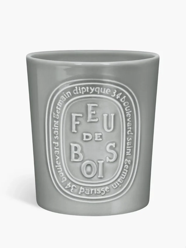 La bougie « Feu de Bois » se présente dans un pot en porcelaine émaillée grise, estampillé de l’ovale Diptyque. Ce parfum emblématique évoque l’odeur d’un feu de cheminée.