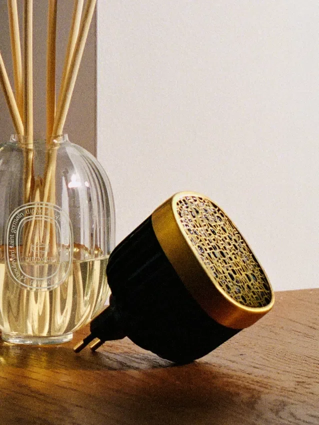 Il suffit d’appuyer pour libérer le parfum. Ce diffuseur électrique utilise l’air lui-même pour diffuser les notes de neuf parfums emblématiques de Diptyque.