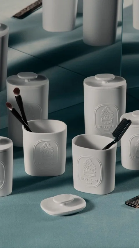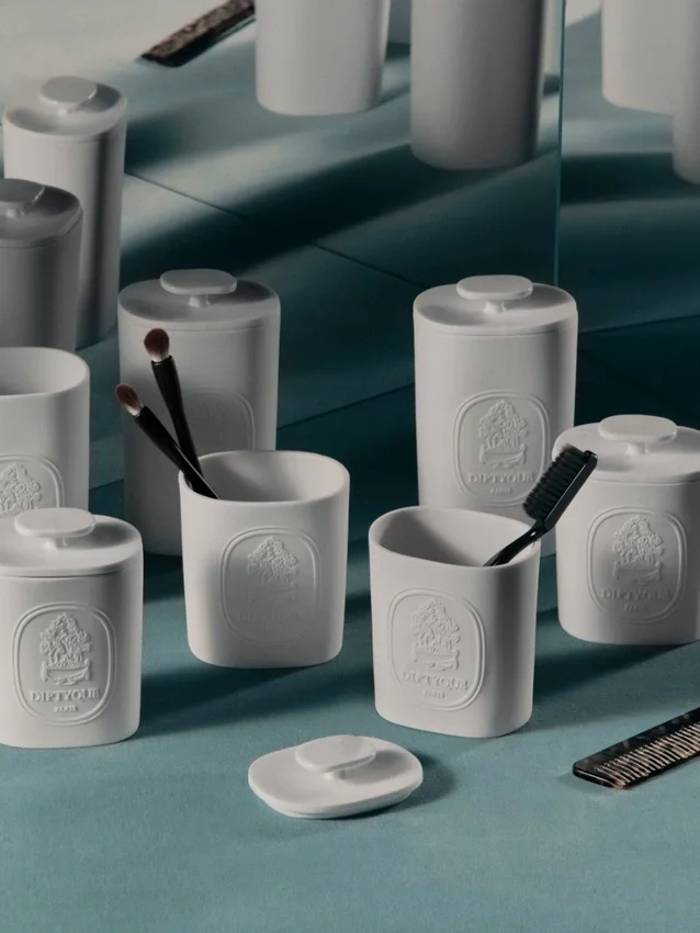 Minimaliste et délicat, un gros plan de l’ovale de la Maison se dessine sous la forme de ce gobelet en porcelaine biscuit.